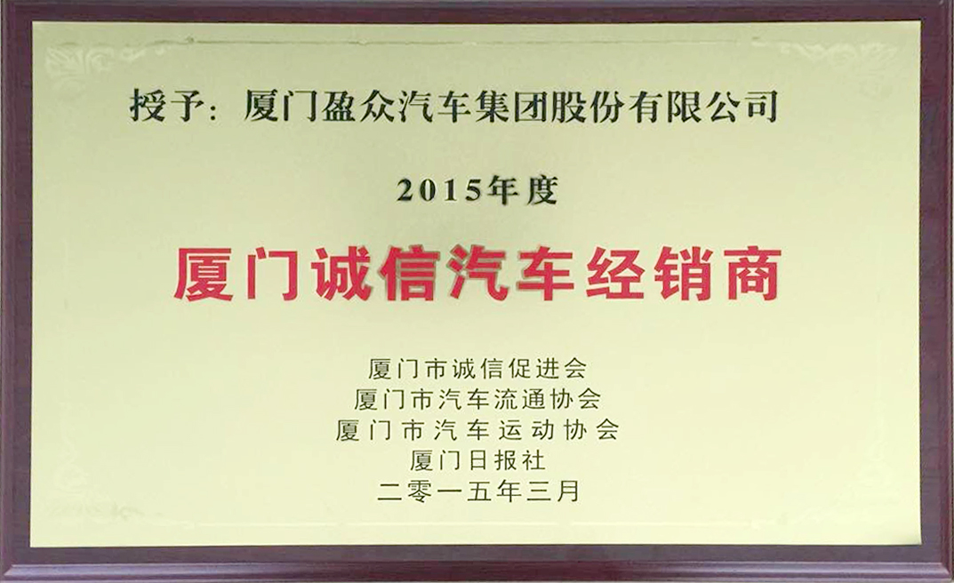 近日,2014-2015年度廈門誠信經銷商榮譽榜單揭曉,盈眾汽車集團憑借“誠信立足社會,服務創造未來”的經營理念,真誠服務客戶的品牌口碑獲得了此項榮譽。