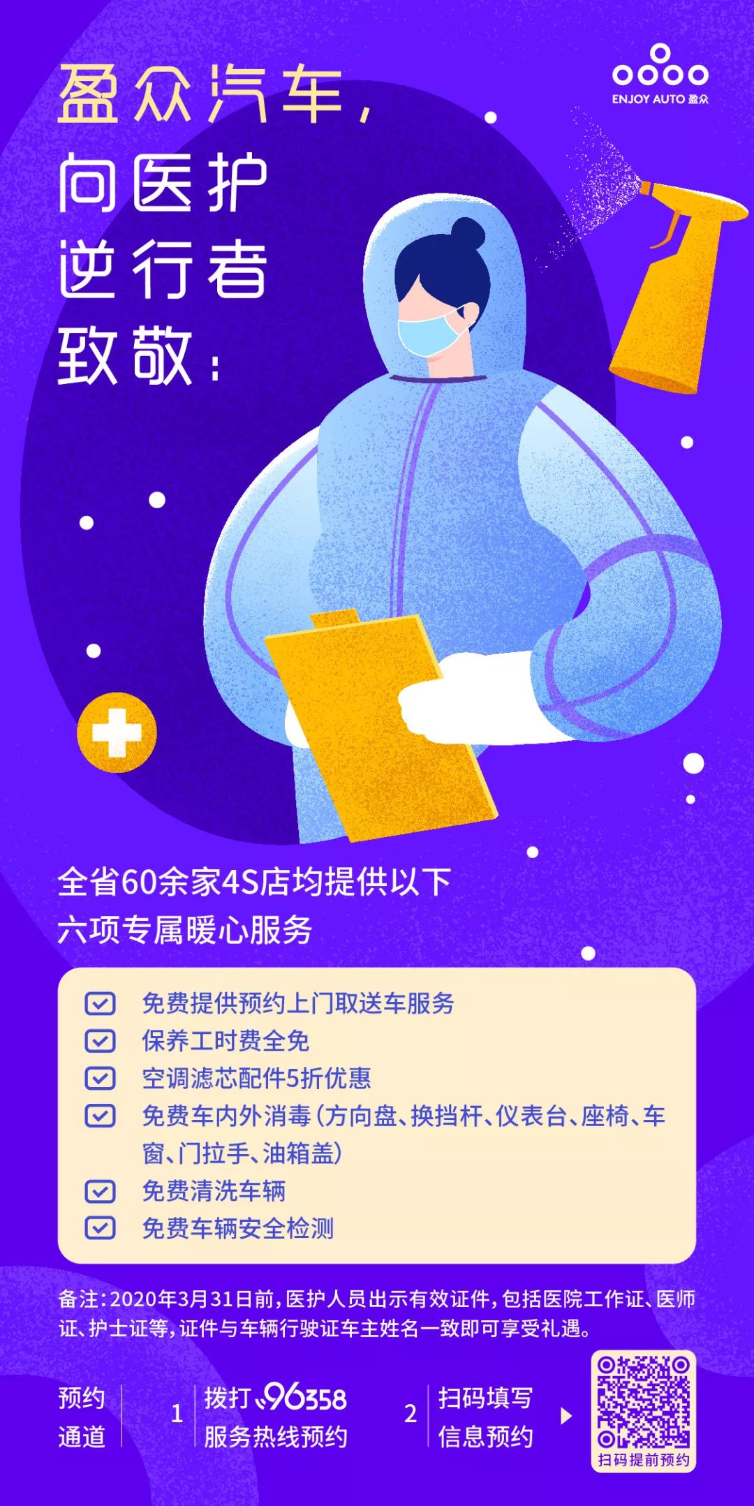 盈眾全省60余家4S店為醫(yī)護人員提供六項專屬暖心服務(wù),2020年3月31日前,醫(yī)護人員可通過以下兩種方式進行預(yù)約——