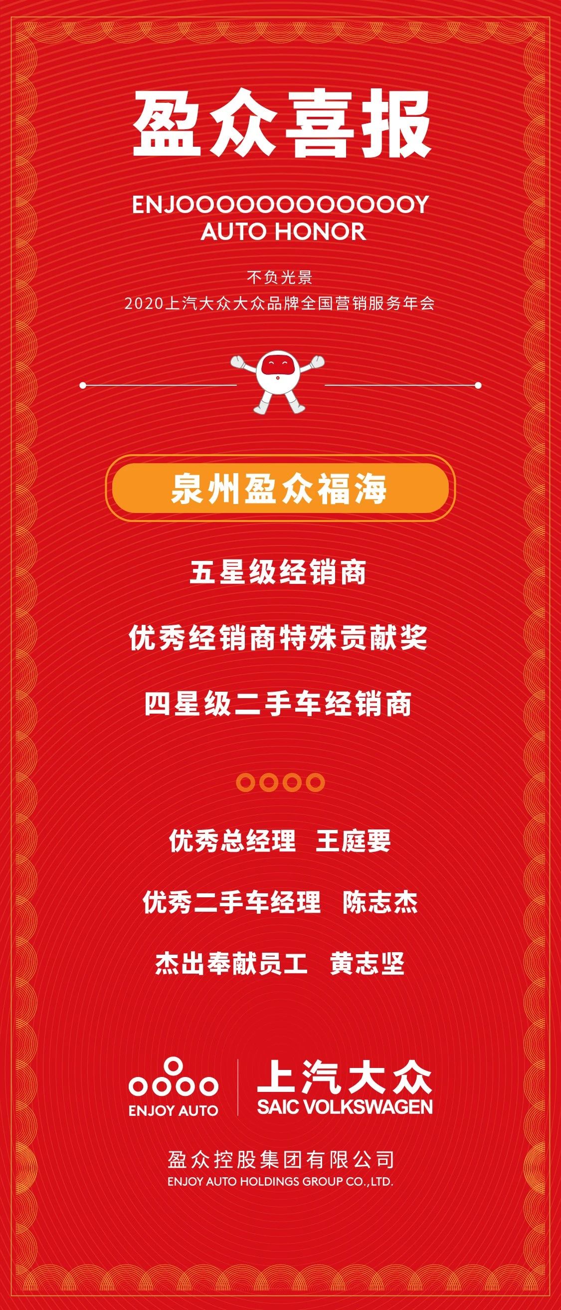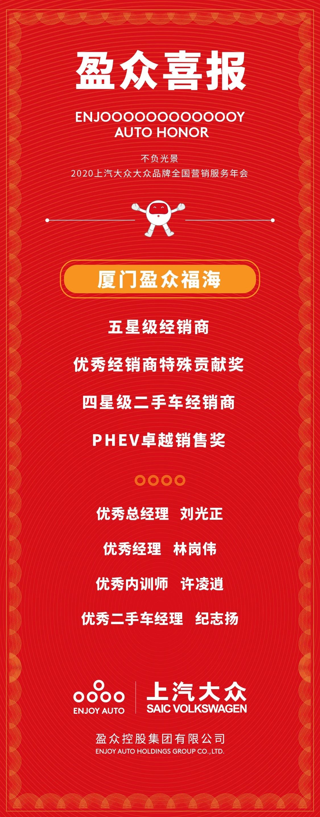 熱烈祝賀盈眾旗下廈門福海、泉州福海4S店從全國1000多家上汽大眾經(jīng)銷商脫穎而出,榮獲多項殊榮。