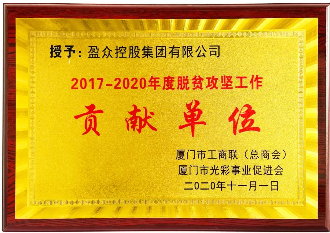 集團榮獲由廈門市工商聯(總工會)、廈門市光彩事業促進會共同頒發的“2017-2020年度脫貧攻堅工作貢獻單位”榮譽,表彰盈眾多年來持續關注脫貧攻堅事業,積極開展向甘肅臨夏州定向捐資精準扶貧、線上助農義賣活動等舉措,為脫貧攻堅做出自己的貢獻。