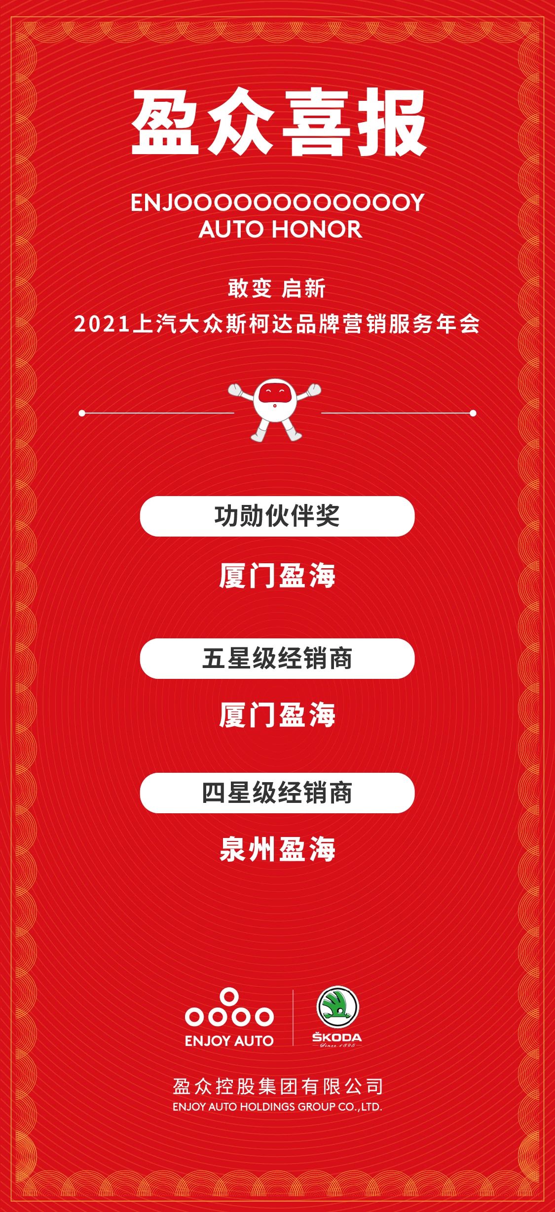 【喜報】盈眾榮獲2021上汽大眾斯柯達功勛伙伴獎、五星級經銷商等多項大獎 2021-02-09 盈眾控股集團 11690次瀏覽 2月9日,“敢變 啟新 2021上汽大眾斯柯達品牌全國營銷服務年會”通過線上直播的形式召開。全國上汽大眾斯柯達經銷商通過網絡直播,共同回顧2020年奮進的足跡,凝心聚力,堅定信心,邁向2021。 盈眾控股集團憑借2020年出眾的銷售業績、高標準的服務水平以及優秀的企業經營能力,榮獲多項大獎。其中,廈門盈海獲得上汽大眾斯柯達品牌功勛伙伴獎,并第12次獲得五星級經銷商榮譽稱號,泉州盈海榮獲四星級經銷商榮譽稱號。 2020年,盈眾斯柯達團隊以堅韌不拔的意志和乘風破浪的勇氣,拼搏奮進,再創佳績。這離不開每一位盈眾人的付出,更離不開每一位客戶的關注與支持。 盈眾控股集團將始終秉持“用科技和文化,讓人們的汽車生活更美好”的企業使命,始終以客戶為中心,持續為客戶提供汽車全生命周期的優質服務,開拓進取,不斷超越,為廣大客戶創造更加美好的汽車生活。 點贊 0 上一篇 下一篇