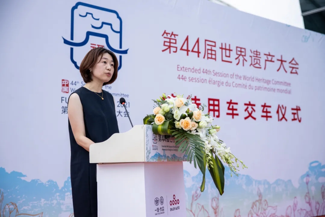 福州盈眾汽車有限公司總經理林晶在致辭中表示,“很榮幸此次盈眾集團與一汽-大眾能夠攜手助力世界遺產大會的舉辦,一汽-大眾長期致力于綠色工廠建設和保護自然環境工作,努力向每一位顧客提供高質量、更為環保的產品和服務。盈眾集團二十余年來,也始終堅持誠信經營,創新服務,踐行企業公民擔當。本次大會接待用車100臺探岳GTE正是一汽-大眾踐行環保理念的產品,同時鑒行著‘綠色世遺’的重要理念,一車多用,綠色出行,一汽-大眾與盈眾集團將嚴格做好此次大會的護航工作。”