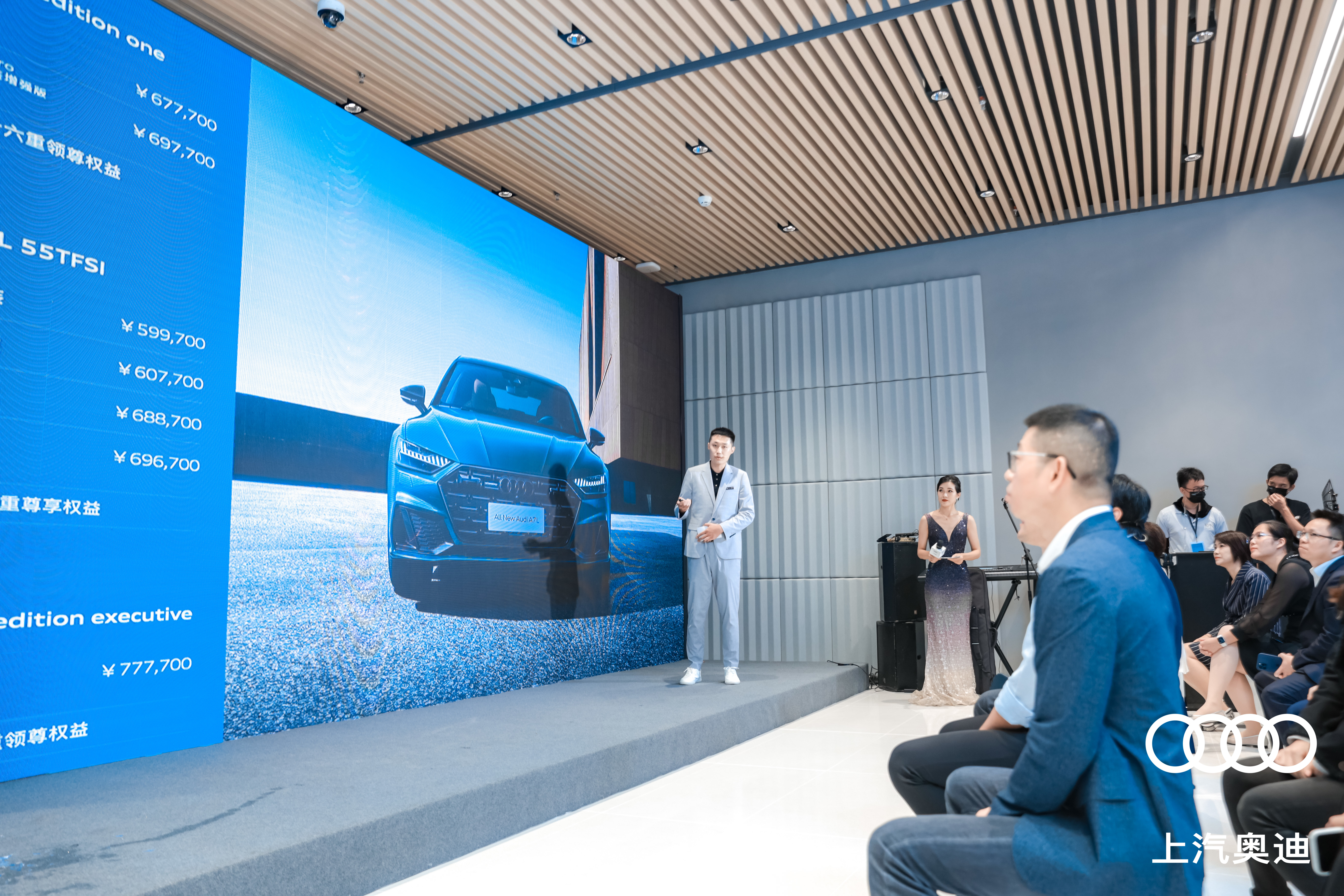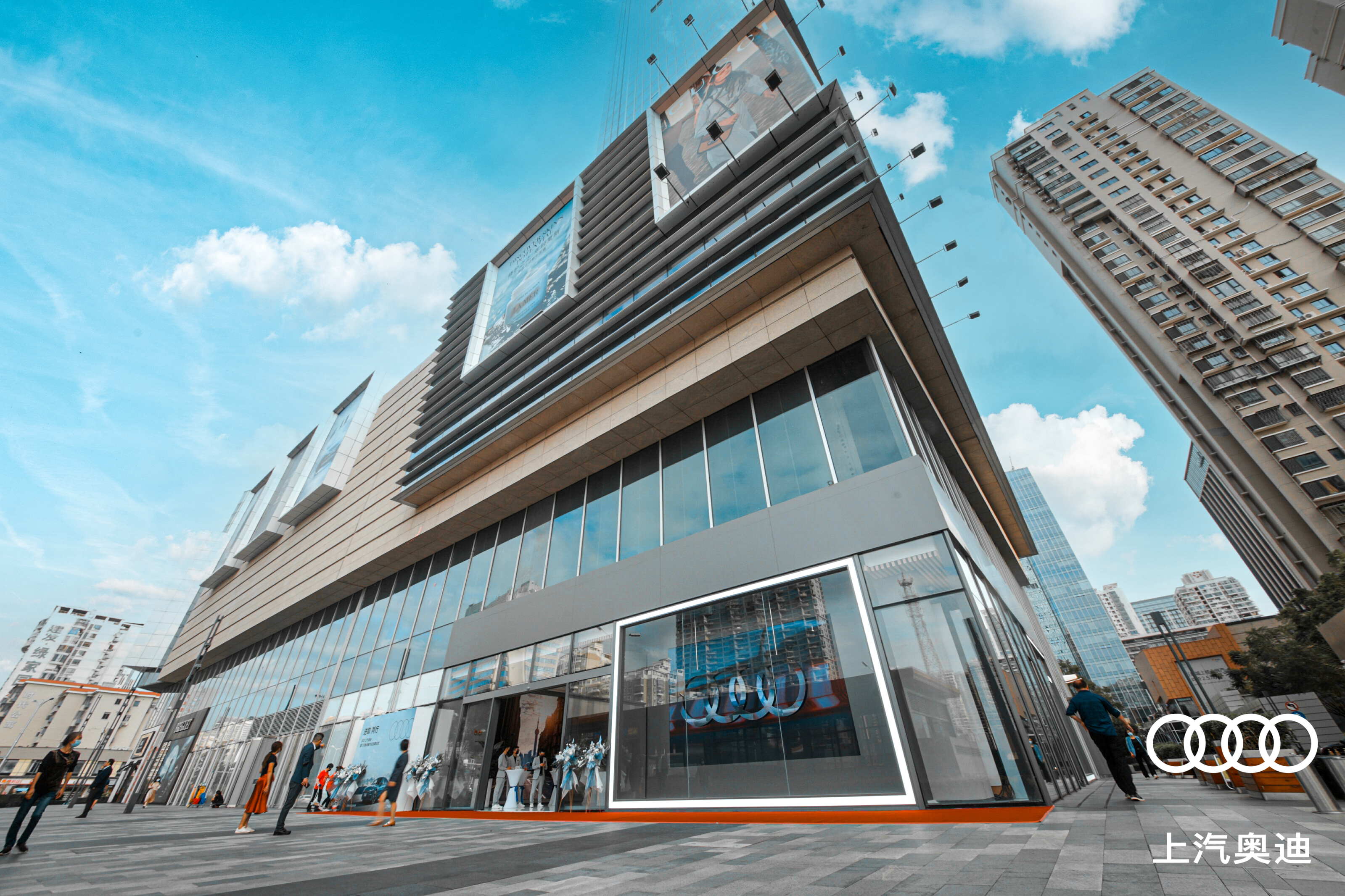 上汽奧迪客戶營銷與數字化高級總監陳歷、品牌渠道營銷高級經理楊曉璐,廈門市汽車流通協會會長丁志強,萬象城商業總經理井橋,以及盈眾控股集團副董事長孫聘仁、副總裁陳偉敏共同上臺為上汽奧迪廈門萬象城都市店開業剪彩,將現場氛圍推向高潮。