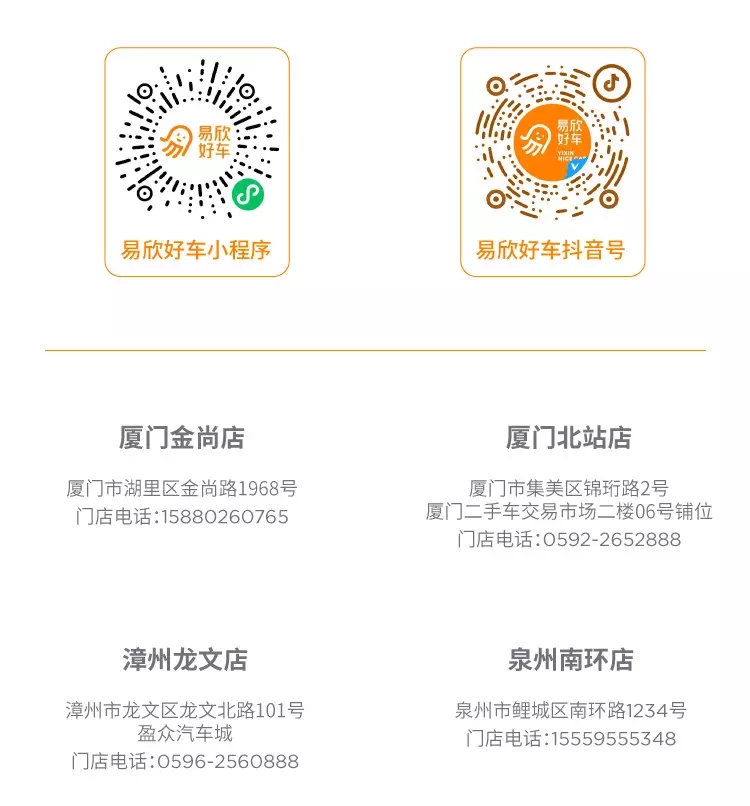 據悉,盈眾旗下二手車品牌易欣好車已經在廈門、泉州、漳州等省內重點城市布局品牌連鎖店,未來還將立足省內,布局省外,為更多客戶提供優質的購車服務。此次全面煥新品牌形象,標志著易欣好車正式邁入品牌化發展新階段,未來易欣好車將持續堅持以誠信和專業,為消費者帶來更優質的二手車交易體驗,讓二手車交易更簡單,讓人們的汽車生活更美好。