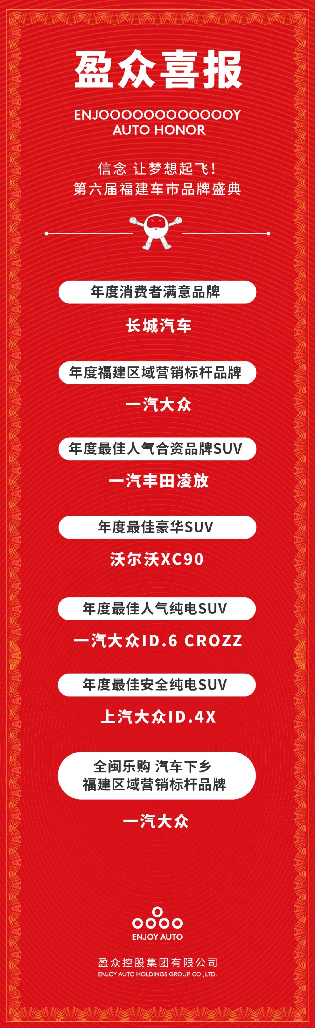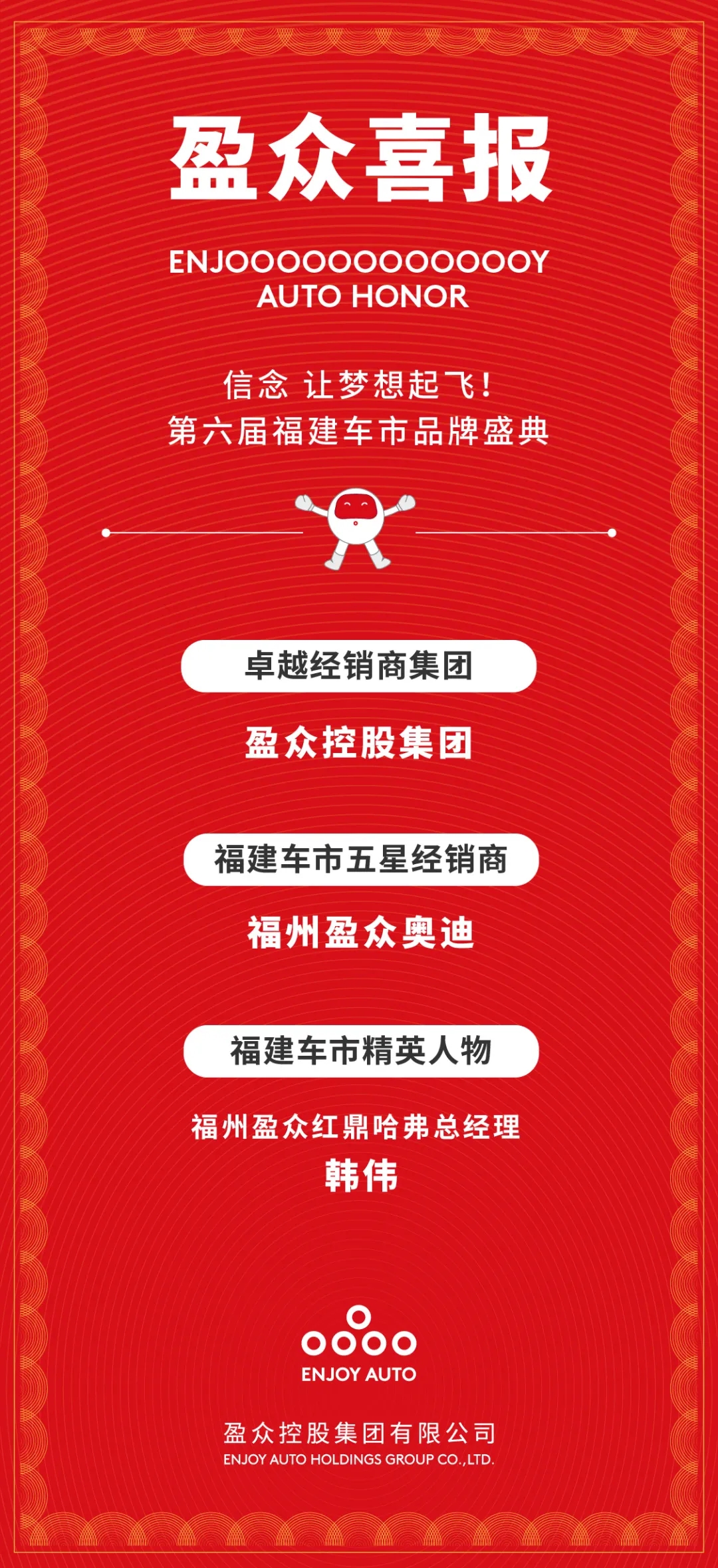 盛典上,福建車市最具人氣的品牌、經銷商、車型、人物等榮譽獎項一一揭曉。盈眾從媒體聯盟專業票選、全省公眾問卷調查、全民網絡投票等多個環節角逐中脫穎而出,榮獲多項大獎。