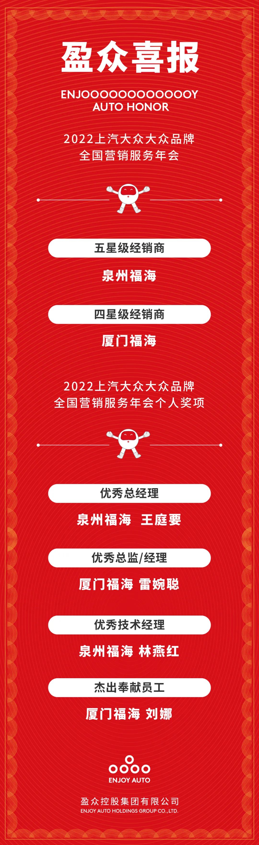 在今天上午召開的“2022上汽大眾大眾品牌全國營銷服務年會”上,2021年度全國優秀經銷商及個人獲獎名單新鮮出爐。盈眾上汽大眾團隊憑借在銷售、服務、客戶滿意度、運營管理等多方面的優秀表現,榮獲五星級經銷商等多項榮譽。