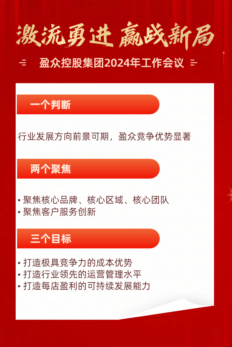 報(bào)告最后,易總對(duì)全體干部提出了要求與期望,希望大家于盈眾同舟共濟(jì),顧全大局;于團(tuán)隊(duì)身先士卒,敢打勝仗;于自己廉潔奉公,守正創(chuàng)新;于過(guò)程全情投入,全程緊盯;于結(jié)果勇于擔(dān)責(zé),言出必踐。“2024年注定是延續(xù)巨大挑戰(zhàn)的一年,望全體同仁,不畏萬(wàn)里關(guān)山,在激流中奮勇前進(jìn),贏取勝利新局面。”