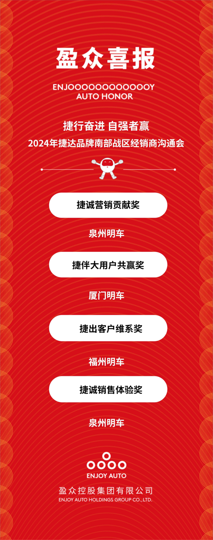 3月14日,以“捷行奮進(jìn) 自強(qiáng)者贏”為主題的2024捷達(dá)品牌南部戰(zhàn)區(qū)經(jīng)銷商溝通會(huì)在海口舉辦。盈眾捷達(dá)團(tuán)隊(duì)?wèi){借2023年在銷售業(yè)績、市場(chǎng)表現(xiàn)、運(yùn)營管理、大用戶拓展等方面的出色表現(xiàn),榮獲