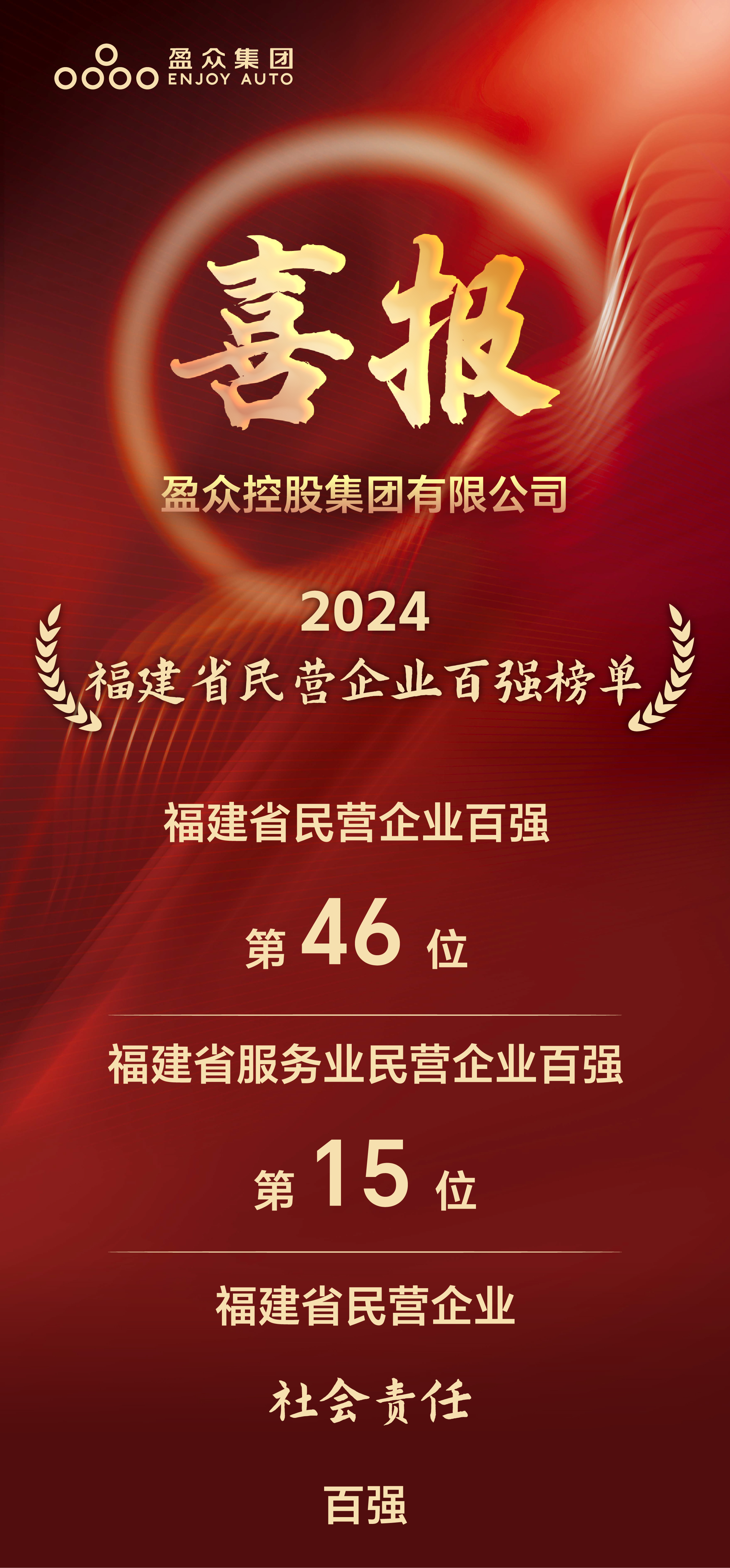9月19日,福建省工商聯(lián)權(quán)威發(fā)布2024年度福建省民營企業(yè)百強榜單,包括2024福建省民營企業(yè)100強、服務業(yè)民營企業(yè)100強和福建省民營企業(yè)社會責任100佳。盈眾集團以優(yōu)異表現(xiàn)榮登榜單,位列福建省民營企業(yè)100強第46位,福建省服務業(yè)民營企業(yè)100強第15位,同時,盈眾控股集團還入圍“福建省民營企業(yè)社會責任100佳”。