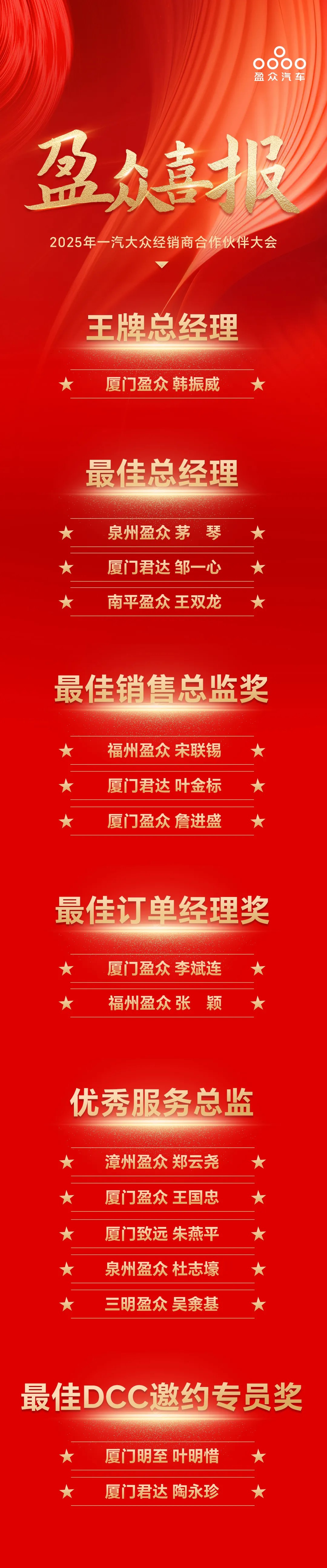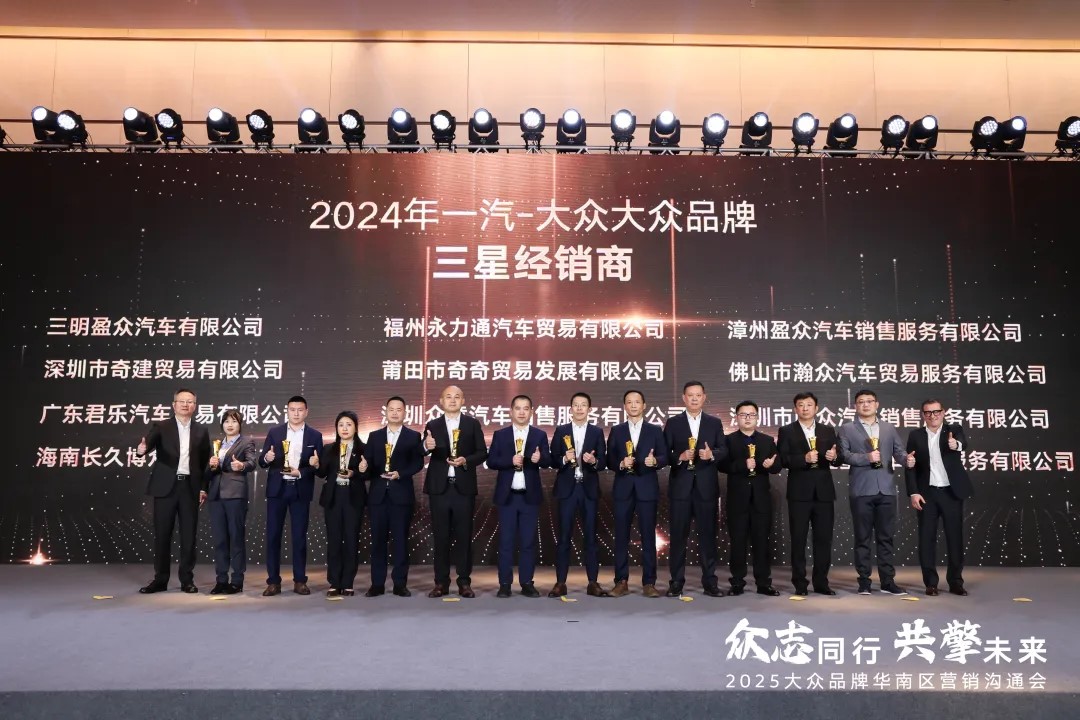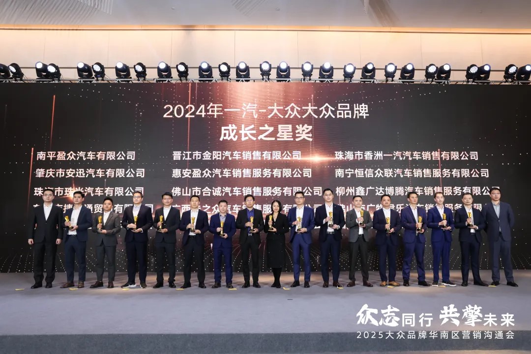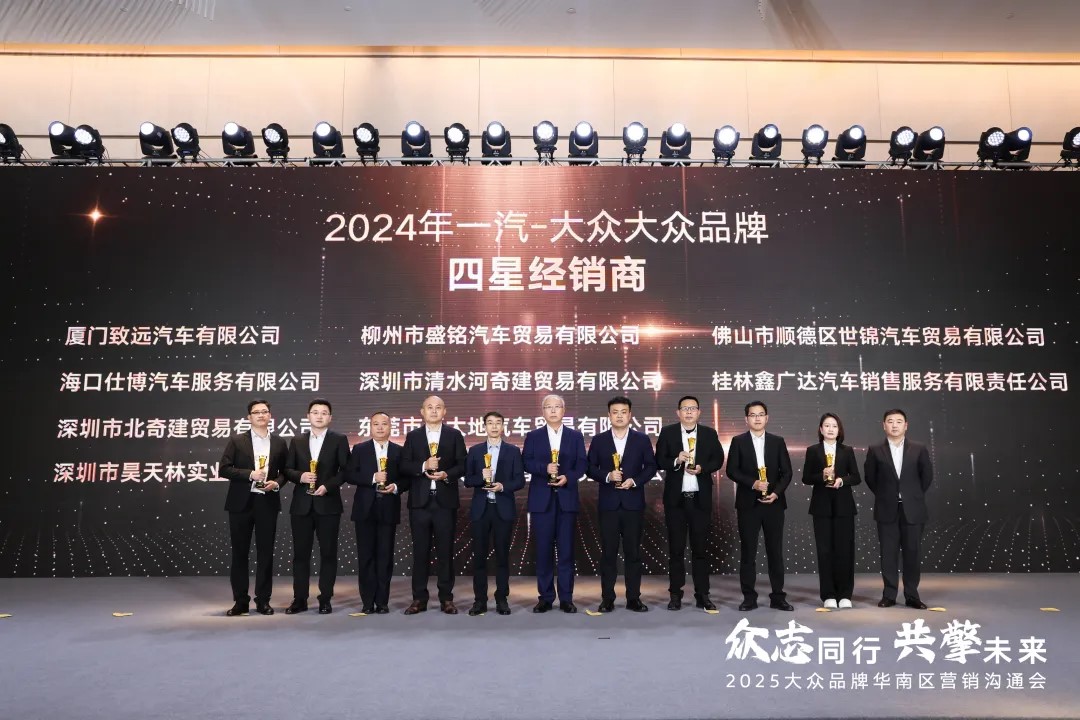 近日,2025大眾品牌經(jīng)銷商合作伙伴大會(huì)、一汽-大眾華南區(qū)經(jīng)銷商年會(huì)相繼召開,2024年度一汽-大眾優(yōu)秀經(jīng)銷商名單及個(gè)人獲獎(jiǎng)名單新鮮出爐。盈眾一汽-大眾團(tuán)隊(duì)憑借過硬的綜合實(shí)力及銷售業(yè)績(jī)、運(yùn)營(yíng)管理、客戶服務(wù)體驗(yàn)等多維度的亮眼表現(xiàn),榮獲“功勛經(jīng)銷商集團(tuán)”“卓越五星經(jīng)銷商”“五星經(jīng)銷商”“王牌總經(jīng)理”等系列獎(jiǎng)項(xiàng)。