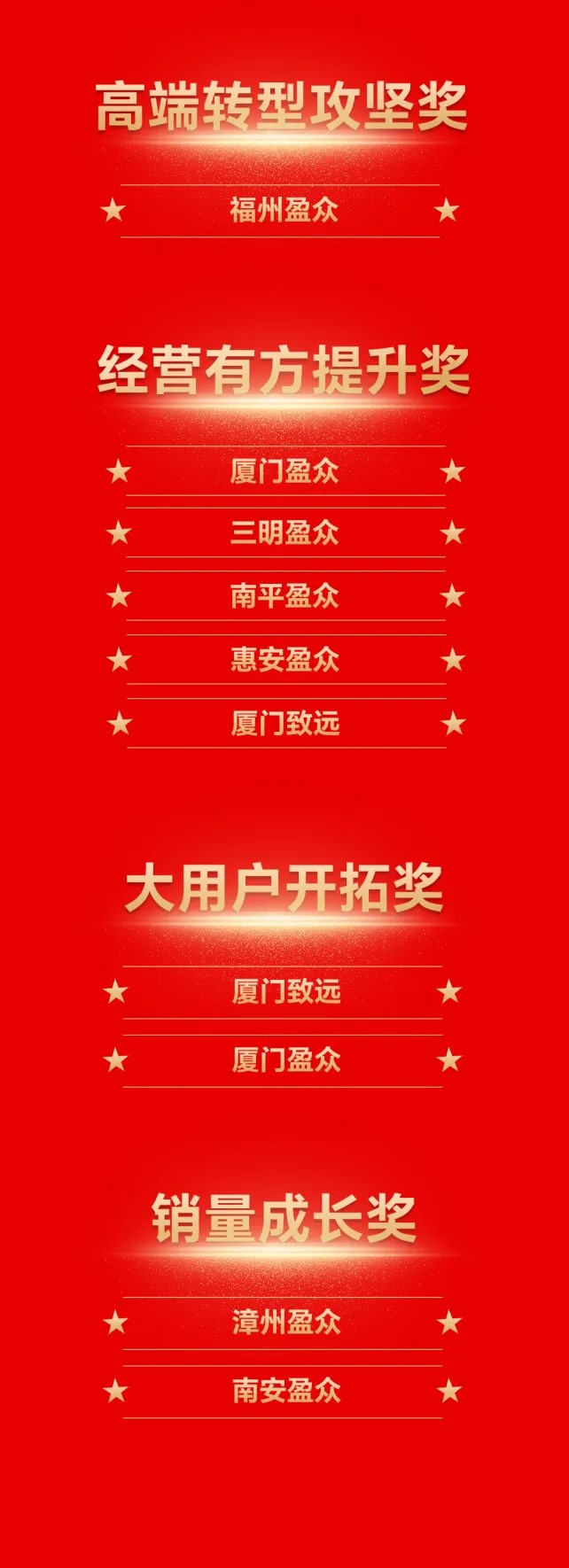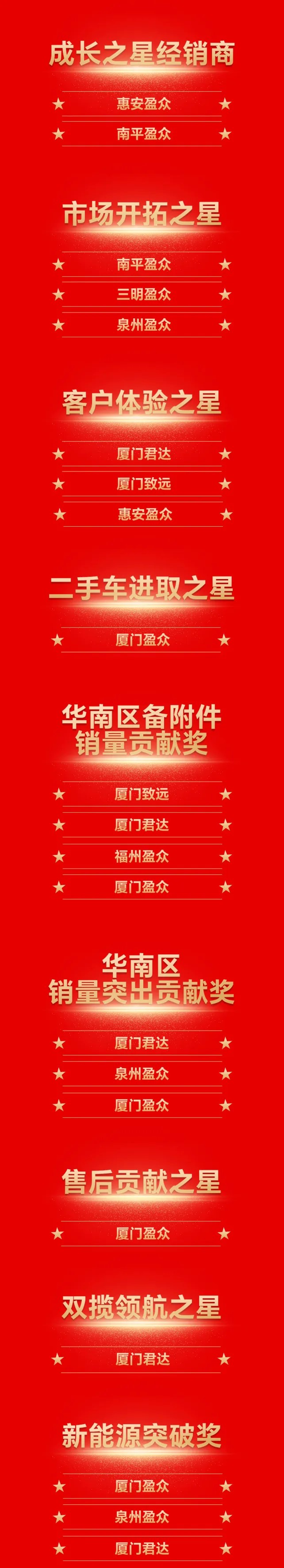 作為一汽-大眾標(biāo)桿經(jīng)銷商,廈門盈眾已連續(xù)16年獲得“五星經(jīng)銷商”榮譽(yù)稱號(hào),今年,廈門盈眾更是成為華南區(qū)首家獲得“卓越5星經(jīng)銷商”的4S店。泉州盈眾、廈門君達(dá)、福州盈眾2024年持續(xù)發(fā)力、多點(diǎn)突破,入選“五星經(jīng)銷商”。廈門致遠(yuǎn)秉持初心,腳踏實(shí)地,獲得“四星經(jīng)銷商”,漳州盈眾、三明盈眾也憑借不懈努力,入選“三星經(jīng)銷商”,惠安盈眾、南平盈眾獲得“成長(zhǎng)之星經(jīng)銷商”。