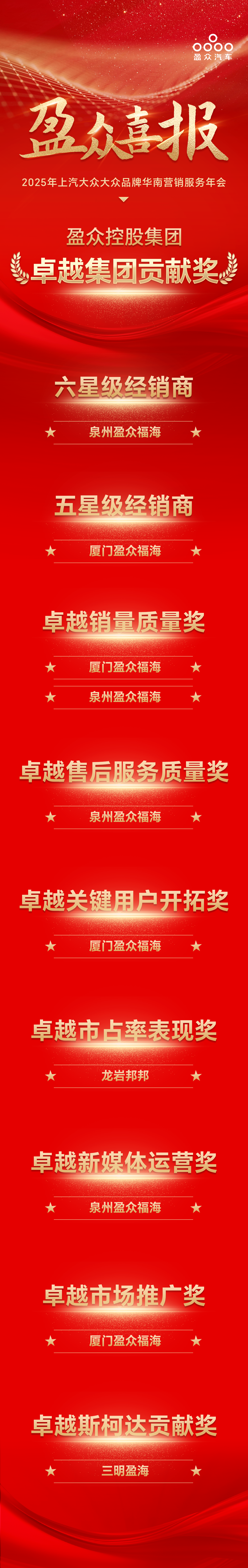 喜報 | 盈眾集團榮獲上汽大眾品牌“卓越集團貢獻獎”“六星級經銷商”等榮譽