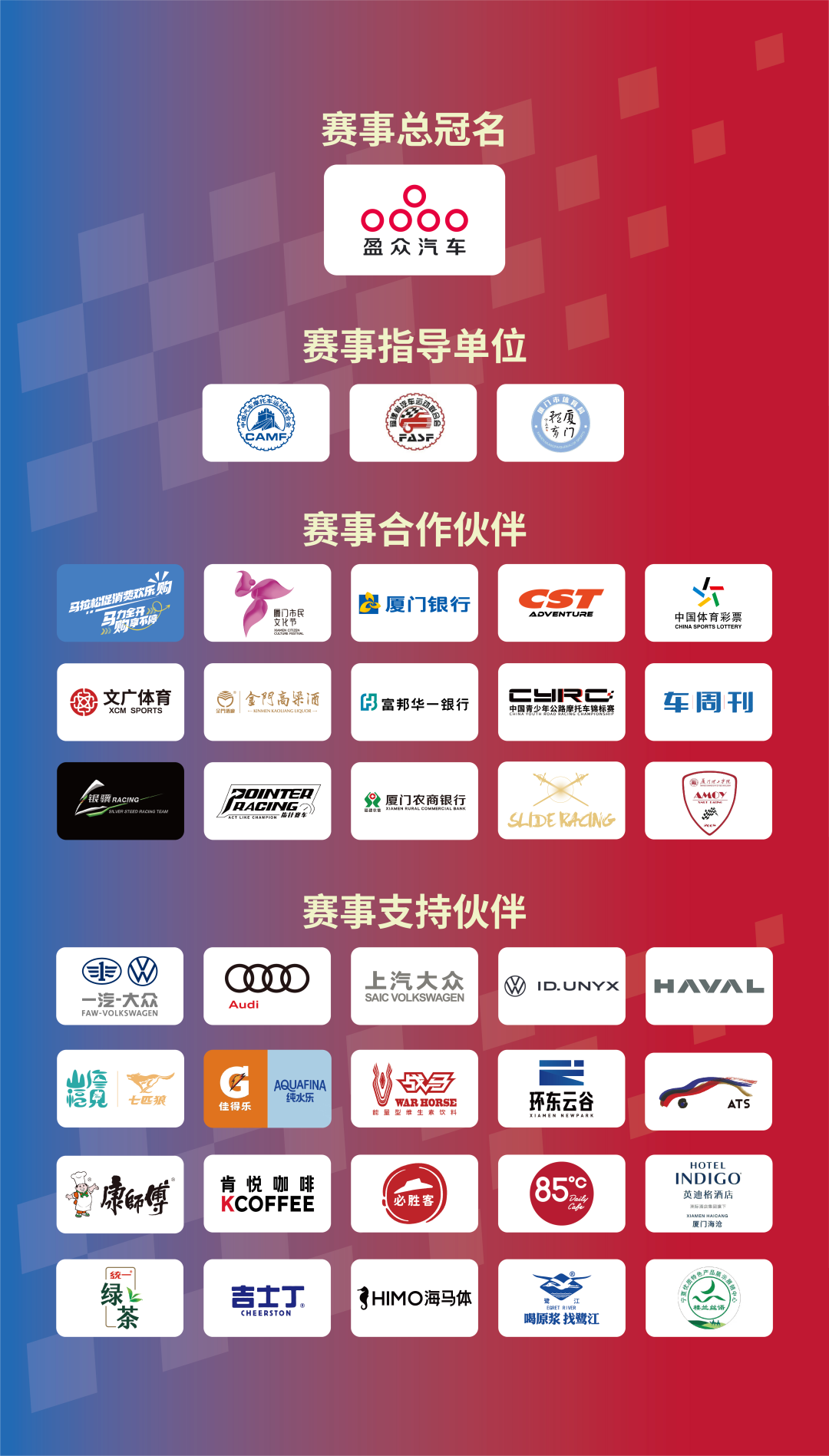 賽事由廈門市翔安區(qū)文化和旅游局、廈門市翔安區(qū)市場監(jiān)督管理局、廈門市翔安區(qū)婦女聯(lián)合會、廈門市翔安區(qū)內厝鎮(zhèn)人民政府主辦;由中國汽車摩托車運動聯(lián)合會、福建省汽車運動聯(lián)合會、廈門市體育局、廈門市翔安區(qū)人民政府共同指導;并得到了廈門文廣體育有限公司、廈門市翔安區(qū)文化館、廈門市翔安區(qū)青少年宮、指針賽車、銀驥賽車、中汽賽智(重慶)體育發(fā)展有限公司、廈門市翔安區(qū)吉他協(xié)會、廈門市翔安區(qū)音樂舞蹈協(xié)會、廈門市翔安區(qū)餐飲協(xié)會等單位和團體的大力支持。